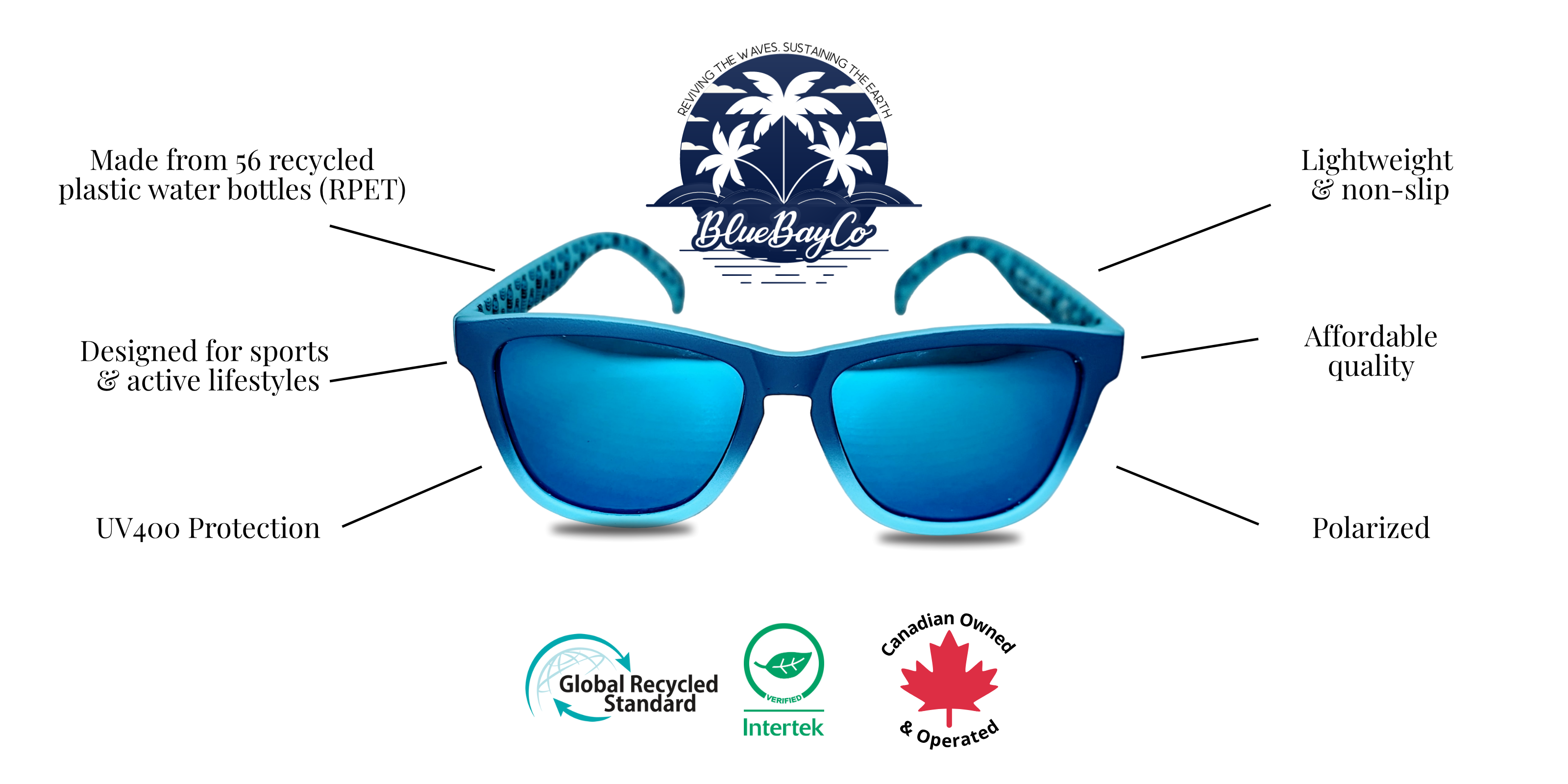 Blue Bay Co. is a Canadian owned and operated business, specializing in recycled sunglasses and apparel. Each pair of recycled sunglasses removes 56 water bottles from our oceans. But we don't just stop there. All of our apparel is made solely from recycled fabrics with environmentally conscious dyes and prints. Proof that style and sustainability can go hand in hand.
